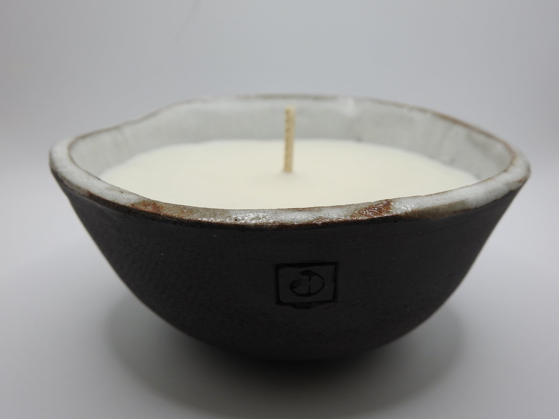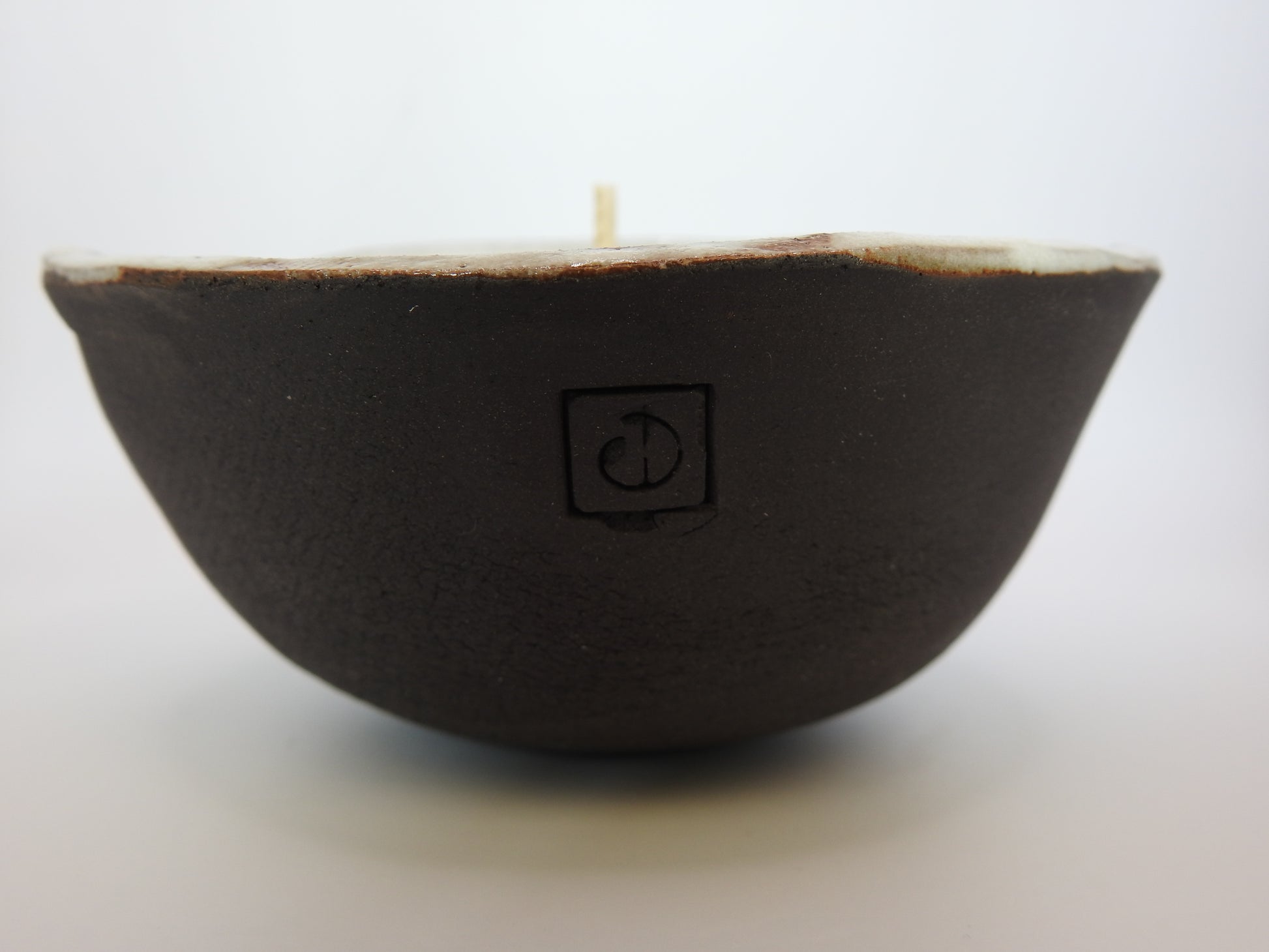 Bougie faite main, émaillée blanc sur terre noire, émail alimentaire.