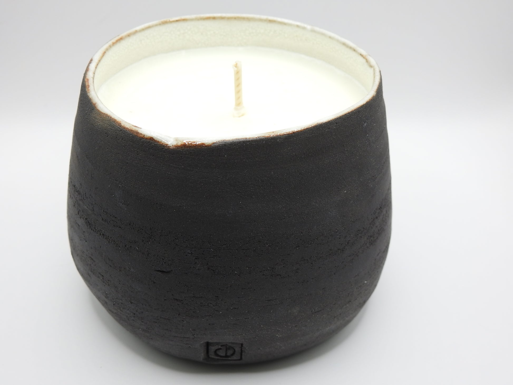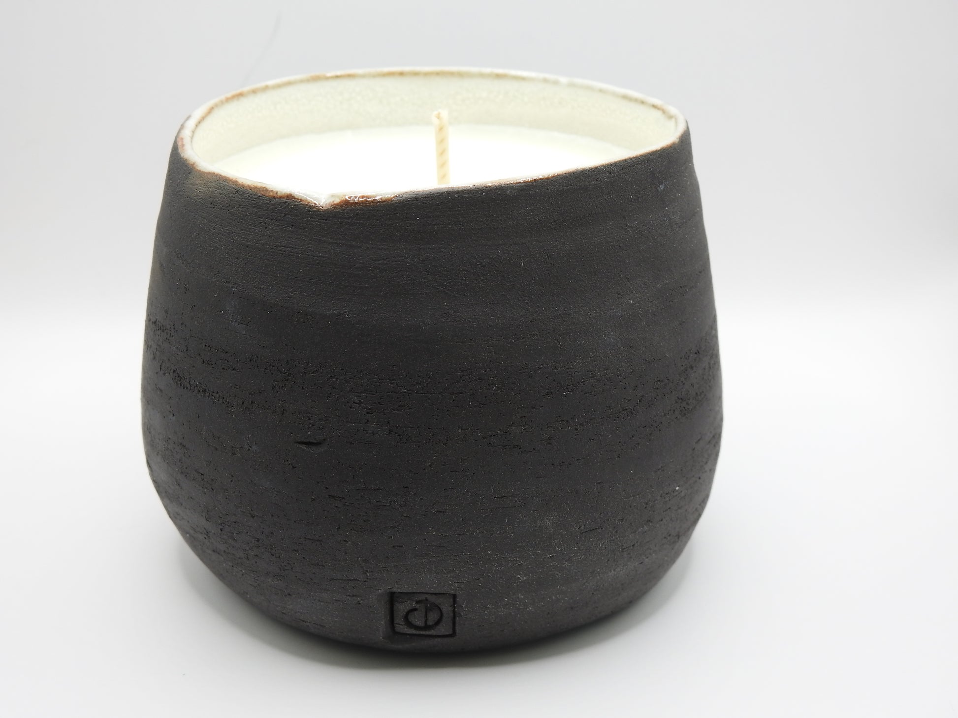 Bougie faite main, émaillée blanc sur terre noire, émail alimentaire.